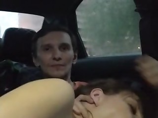 Schmutzige Schlampe arbeitet oral mit einem blowjob im Auto